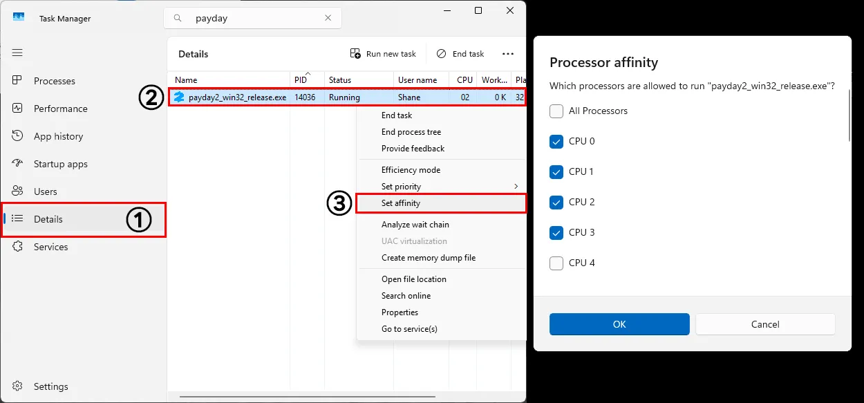 PowerShell to Set PAYDAY 2 process CPU Affinity (CPU 0, 1, 2, 3) for Avoid Win11 24H2 freezing.