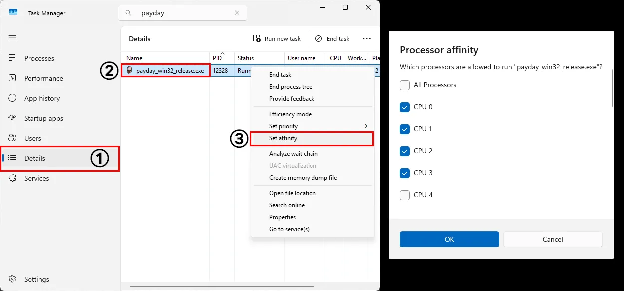 PowerShell to Set PAYDAY: The heist process CPU Affinity (CPU 0, 1, 2, 3) for Avoid Win11 24H2 freezing.