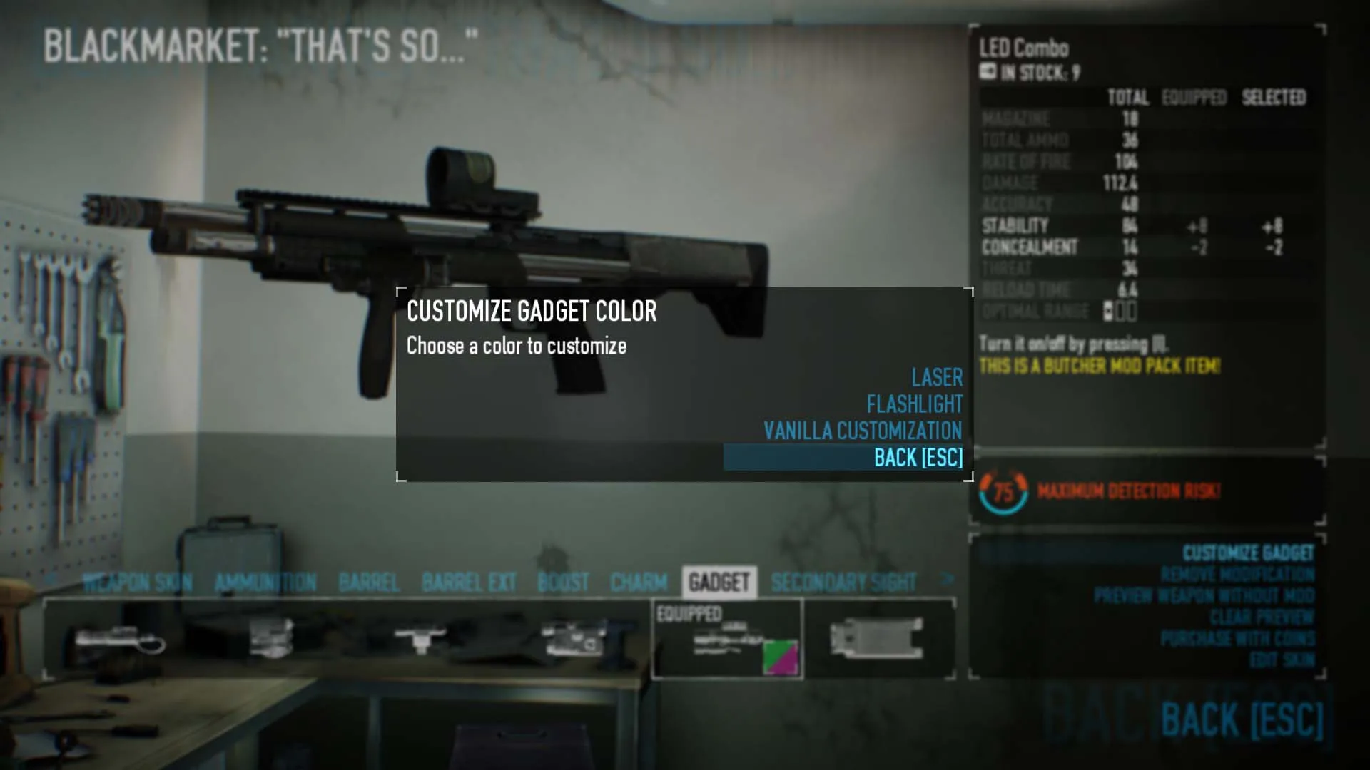 - You only have the option to use the vanilla customization ui if you are customizing a gadget that has both a laser and a flashlight, eg. the Combined Module, Military Laser Module, or LED Combo. This is because I think it's annoying to have to navigate through an extra dialogue box every time you want to customize a gadget when you don't actually need to.