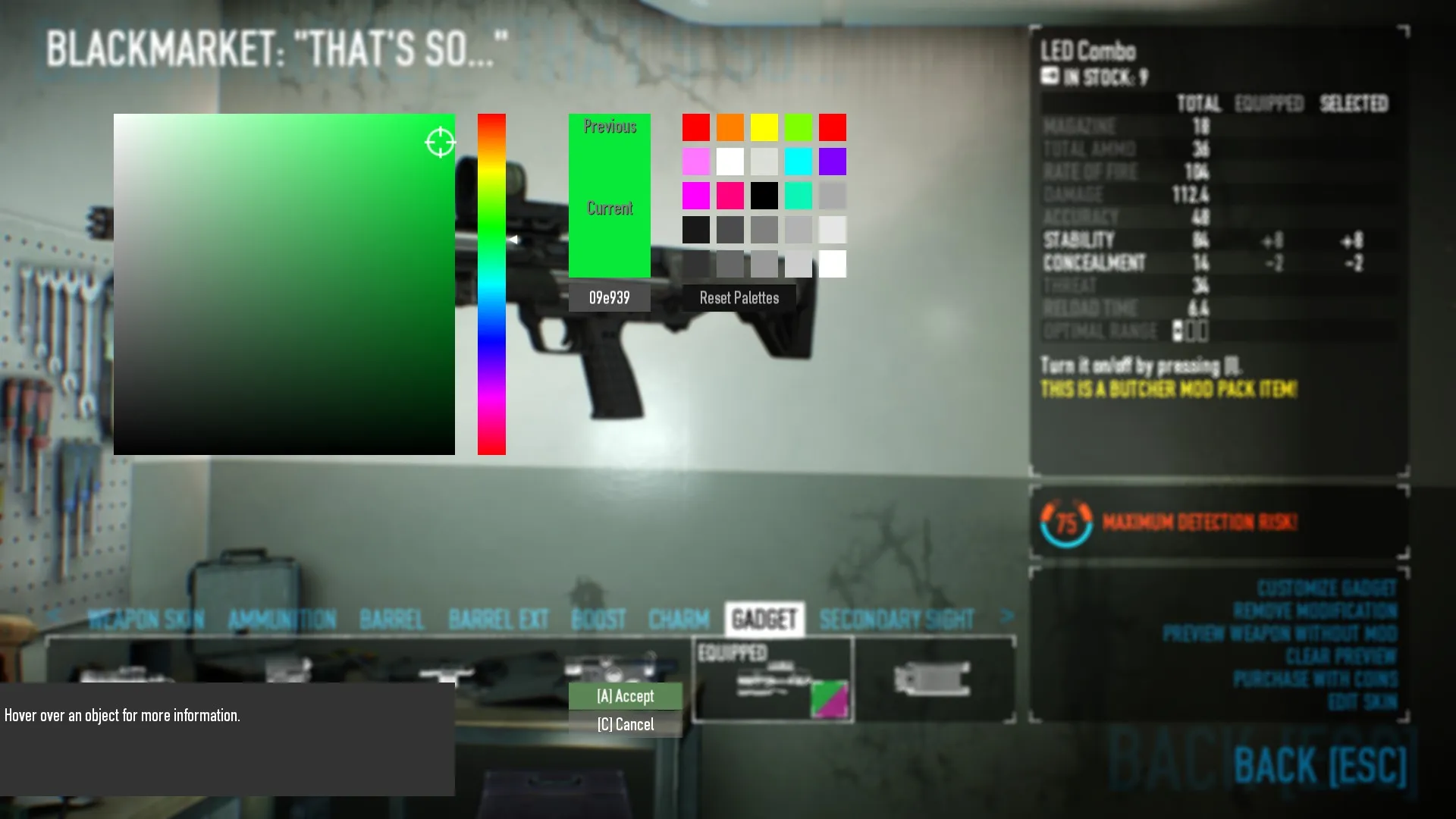 - The color preview in the blackmarket ui does not immediately update with your chosen color. This is purely a cosmetic issue; your changes will still be applied properly to the gadget.
