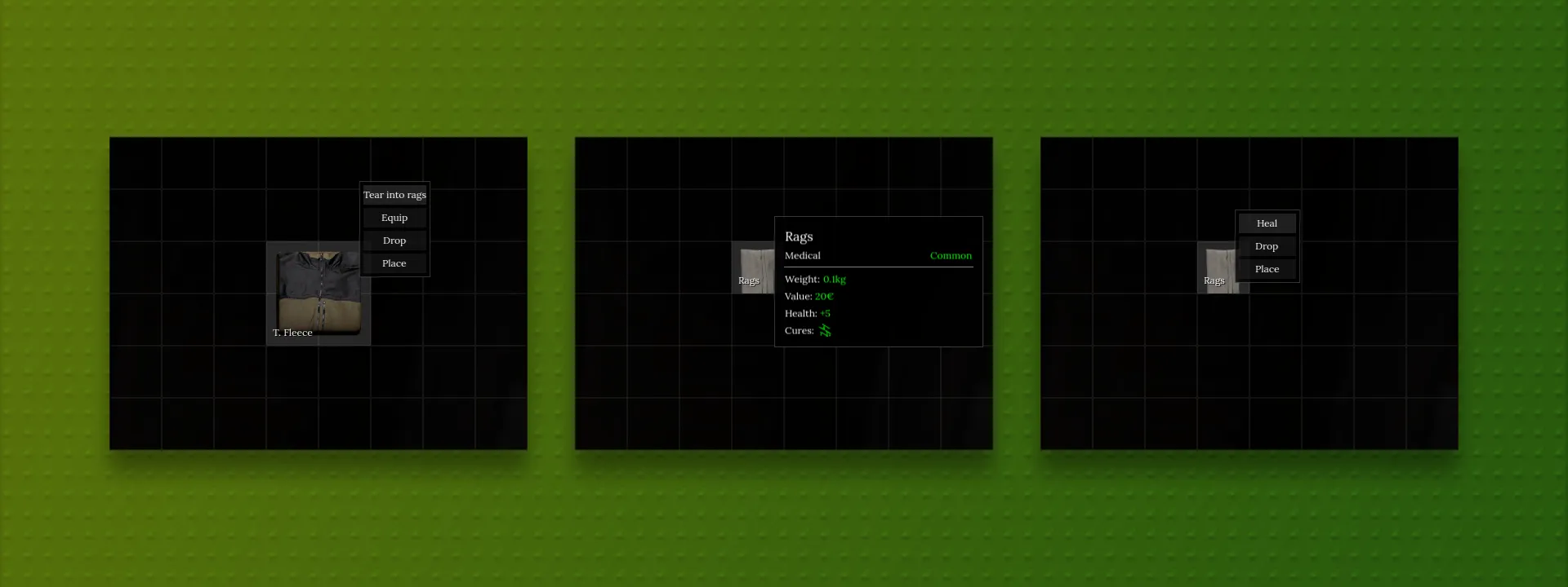 Amount of rags yield depends on item inventory size and clothing equipment type (for example, hats: 1 rag, torso: 2-3 rags, legs: 1-2 rags).